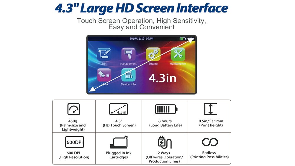 - HH6105 Series Handheld Printer, Printing Height 12.7mm, Whole Machine is 450g, Lightweight and Flexible.